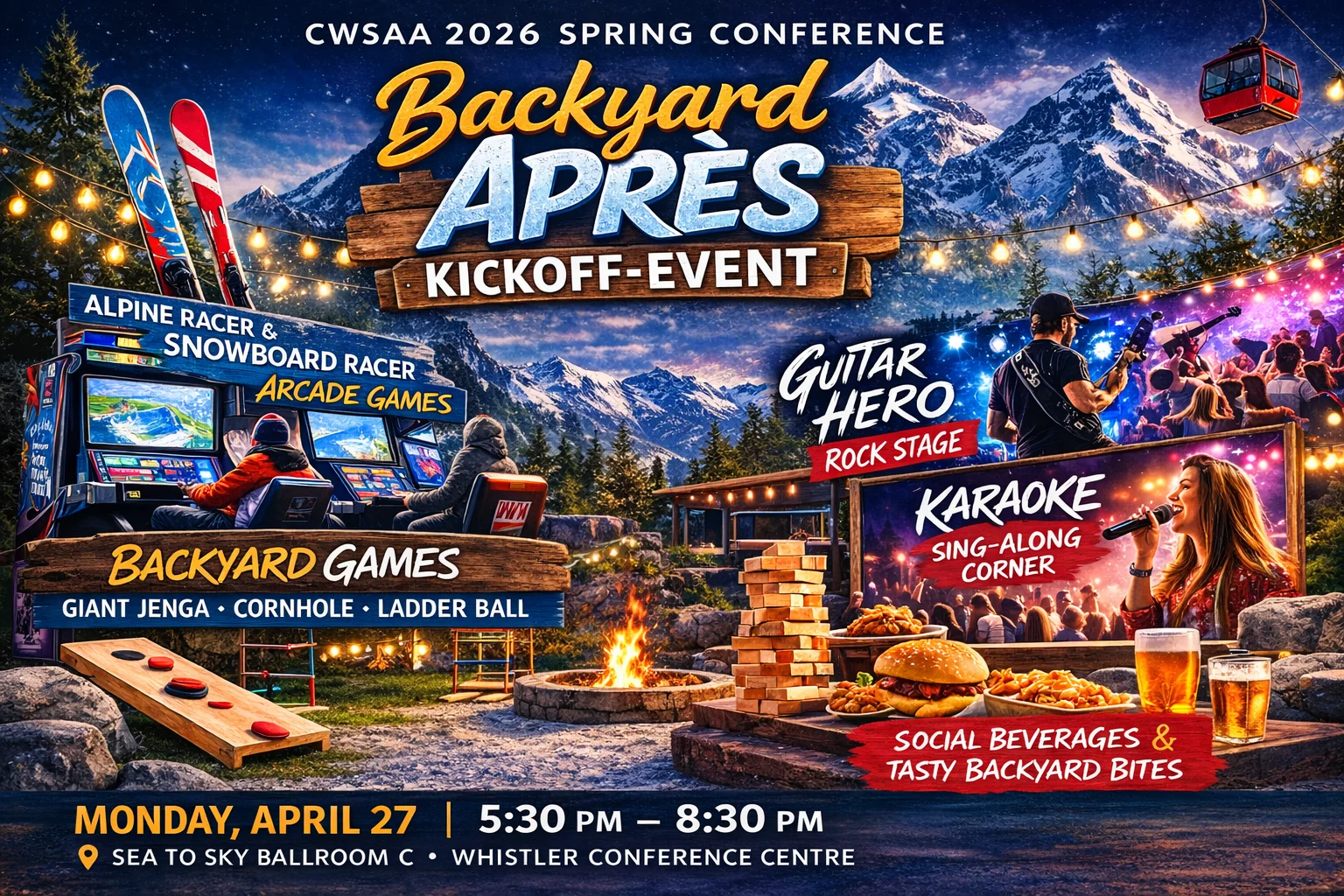 New this year, we are excited to have a themed Backyard Après Kickoff Event Monday April 27 from 5:30 - 8:30pm at the Whistler Conference Centre. Come pick up your conference name badge and join the fun with a relaxed and interactive evening designed to bring the ski industry together.
